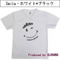 アロハナオリジナルのフラTシャツ。大きなSmileにプルメリア等のキュートなデザイン。ベースカラー白、プリントカラーは「ブラック」。紫外線予防加工や吸水速乾等、サラッと着心地の良いドライTシャツ。乾燥機もOK。サイズは2サイズ。