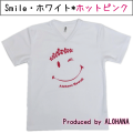 アロハナオリジナルのフラTシャツ。大きなSmileにプルメリア等のキュートなデザイン。ベースカラー白、プリントカラーは「ホットピンク」。紫外線予防加工や吸水速乾等、サラッと着心地の良いドライTシャツ。乾燥機もOK。サイズは2サイズ。