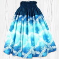 ハワイアンファブリック柄:グラデーションのティール・ターコイズにレフアとマイレレイ柄。ウエスト無地カラー:ティール(ブルーグリーン)。切替しがオシャレなオリジナルのパウスカート。国内自社縫製。返品交換不可。