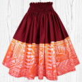 ハワイアンファブリック柄:アプリコットのグラデーション風にカヒコ調の柄とシルエットのフラガール柄。無地のワインカラーとの通常とは異なるスカート下部での切替しがオシャレなオリジナルのパウスカート。国内自社縫製。返品交換不可。