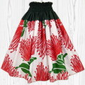 ハワイアンファブリック柄:ホワイトをベースに大きなレフア柄。ウエスト無地カラー:ダークグリーン。主張する大きなレッドレフアと引き締まった色合いの切替しがオシャレなオリジナルのパウスカート。国内自社縫製。返品交換不可。