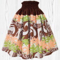 ハワイアンファブリック柄:ナチュラルカラーにカヒコ模様とオレンジのティアレボーダー柄。ウエスト無地カラー:ブラウン。ククイのレイ等全体的なプリントのバランスがオシャレなオリジナルのパウスカート。国内自社縫製。返品交換不可。