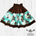 ハワイアンファブリック柄:ターコイズ地にブラウンのハイビスカス柄。ウエスト・裾無地カラー:コナコーヒー。切替しがオシャレなオリジナルのパウスカート。丈約73cm前後、ゴム3本。国内自社縫製。返品交換不可。