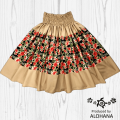 ハワイアンファブリック柄:ハワイアンコットン100%のブラック地にハイビスカスとプルメリア柄。ウエスト・裾無地カラー:ベージュ。切替しがオシャレなワンランク上のオリジナルのパウスカート。丈約73cm前後、ゴム3本。国内自社縫製。返品交換不可。