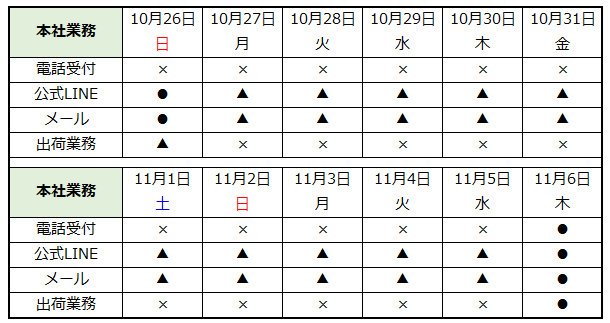 10/26~11/5まで、海外への出張業務の為、下記の対応になります事をご了承ください。
