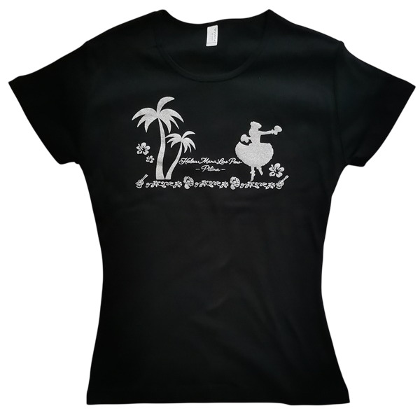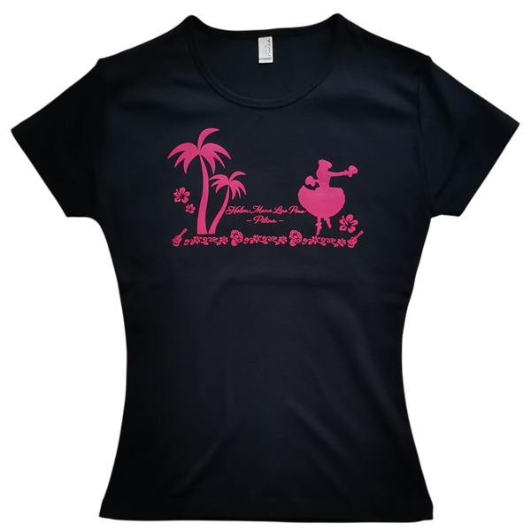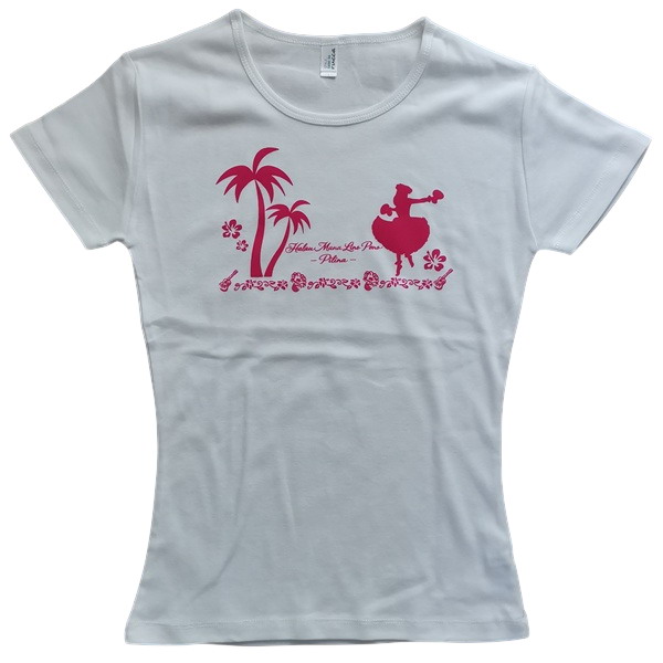 アロハナの既存ロゴを加工してのオリジナルフラTシャツです。ベースになったTシャツは「レディスフライスTシャツ」。女性らしいシルエットにしっかりとした生地とストレッチ性が人気のTシャツになります。